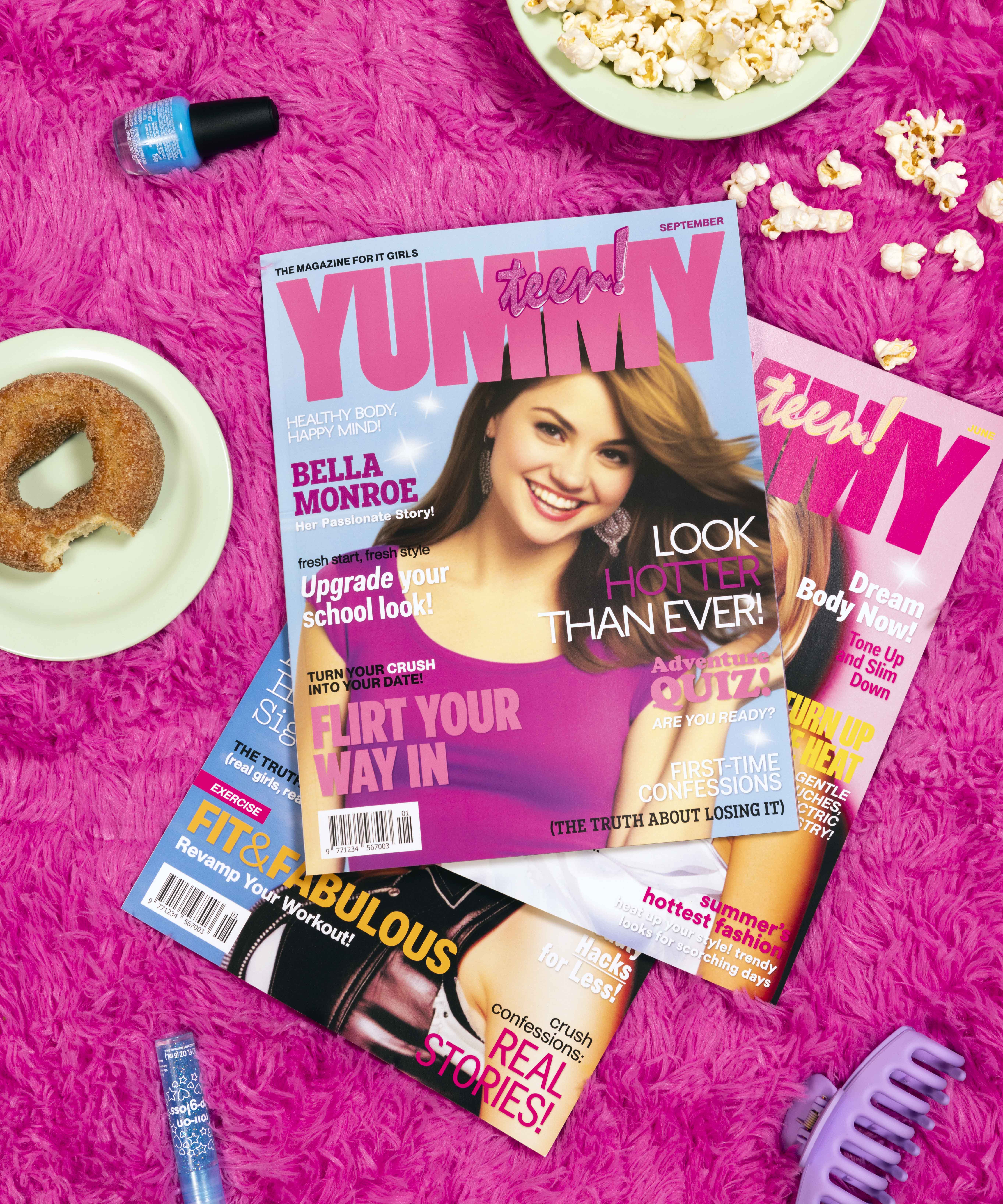 In this case, Yummy (Teen Edition)’s glossy images and catchy headlines were created entirely through AI—a model trained on a generation’s media consumption and synthesizing an imaginary world set in the realities of the early 2000s. Fashion spreads, photographs of teen heartthrobs, and dogmatic advice columns reflect the value systems promoted through media culture in the early aughts, reproduced perhaps as readily and uncritically by an AI model as they were consumed by young readers at the time. Brightly colored headlines, advertisements for beauty products, diet and exercise tips, and a homogenous array of teen faces fill magazine covers and interior pages in a context that is both dated and yet still reflective of much of today’s media culture. Targeted specifically to young women, these pages recall and reinforce a shaping of ideas about diet culture, desire, and self-presentation, while also underlining the inherently sexist, fatphobic, and racist themes present throughout.